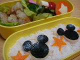 *今日のお弁当* ・ ミッキーキャラシート(海苔、ハム、チーズ) ・ 冷凍コロッケ ・ キュウリの塩昆布和え ・ ブロッコリー、 プチトマト、 キャンディーチーズ、 にんじん 今日はお弁当3連ちゃんの最後だったので手抜きです〜。 冷凍コロッケを使ったし、ミッキーの海苔は市販のミッキー海苔を使いました〜(汗) 暑くなってきたから、お弁当も考えないといけないなぁ。 |