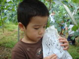 ぶどう狩り(平成20年8月26日)今日は待ちに待ったブドウ収穫の日です。 おーちゃんもきーくんも大はりきりで出発しました。 袋がけを したときにはまだまだ緑で小粒だった実も、立派にみずみずしい ぶどうになっていました♪ さっそく食べてみると甘い!! きーくんはむさぼるように食べて いた・・・(苦笑) おーちゃんも食べるには食べていたけど、 お友達と遊ぶのには替えられなかったみたい(爆) 汗だくになって お友達と走り回っていました〜。 本当に楽しかったようです♪ 終わった後、みんなでランチをして帰りました♪ |