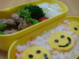 久々キャラ弁(平成20年9月4日)おーちゃん、今日からやっと通常保育開始です。 8月末に簡単なお弁当を持っていかなければいかず、そのときは 普通のお弁当を持って行っていました。 なので今日は久しぶり にかわいい(!?)お弁当を作らなきゃなぁと思ってたママ。 でも、休み明けなのでやっぱり簡単キャラ(爆) スマイルくんです。 これ、ママが中学とかの時にすごい流行った 覚えがあります。 書くのが簡単でかわいいので好きだった〜♪ *今日のお弁当* ・ スマイル君(お弁当シート・黄色、 のり) ・ シャケごはん ・ つくね(豚ミンチ、しいたけ、玉ねぎ) ・ ブロッコリー、プチトマト、 梨 すごくきれいに食べてきてくれました♪ こんなお弁当箱を見るとすごく嬉しく なります。 |