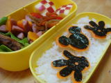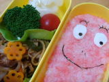 今日のお弁当(平成20年9月9日)*今日のお弁当* ・ バーバパパごはん (桜でんぶ、卵白焼き、のり) ・ 焼きそば(ニンジン、ピーマン、モヤシ、豚肉) ・ ブロッコリー、トマト、梨 今日のお弁当はおーちゃんのリクエストで焼きそばに。 かなり炭水化物ばかりだけど、おーちゃんがよかったらそれでよし〜。 キャラは微妙なバーバパパになりました(爆) でもおーちゃんが見てすぐにわかってくれた のでこれもまたよし! |