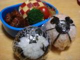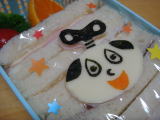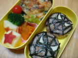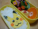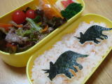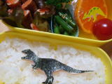 今日のお弁当(平成20年11月11日)*今日のお弁当* ・ トリケラトプスキャラシート(のり、チーズ) ・ 野菜炒め(牛肉、ピーマン、ニンジン、たまねぎ) ・ ブロッコリー、プチトマト、りんご、みかん 図鑑からトリケラトプスを写してのりを切っただけの簡単弁当 なのですが、やっぱり男の子なのでうれしいようです。園でも 男の子たちから「うぉ〜♪かっこい〜!」と評判がよかったようです。 |