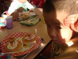 | ゆっくり(平成20年11月24日) きーくんがまた体調を崩しています。咳がひどく、夜ゆっくり寝られないみたい。 幸い、熱は出ていないので様子を見ようと思っています。 そんな状態なので今日は午前中、おーちゃんとパパは二人でジャスコへ行きました。 ママときーくんはおうちでゆっくり。ママが家事をしている間は一人で机に向かって きりえをチョキチョキ。 ママの手が空いたら絵本を一緒に読んで過ごしました。 お昼にはパパとおーちゃんも帰ってきたので、ピザをホームベーカリーで作り みんなで食べました(お留守番していたきーくんがお手伝いしてくれたよ♪) |