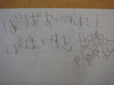 お友達が遊びに来ました(平成20年11月19日)今日はクラスは違うけれど一緒のバスで仲良くしてくれている 男の子が遊びに来てくれました。 上に小学生のお兄ちゃん お姉ちゃんがいるので、2時過ぎにお母さんが送ってくれて 5時まで預かる形で遊んだよ〜。 ポケモンカードとすごろく を持ってきてくれたんだけど、うちにあるゴーオンジャーの ロボットにはまってしまい(苦笑)おーちゃんがポケモンカード を教えて〜! と言っても「後でな〜」と言われる始末(汗) お互いの家で遊ぶと、もっていないおもちゃで遊びたいのは仕方ないよね〜。 おやつを食べて、やっとポケモンカードではなくバトルスピリッツで遊んでもらえた おーちゃんです(これは結構長く遊んでいた) 最近パパがとても忙しく、連日連夜の残業です。 それでいつも夜はバタバタして しまうのですが(一人でお風呂など入れないといけないので)この2週間テレフォン イングリッシュをすっかり忘れていました(汗) 今日はもう寝るぞ!という8時に 思い出した!! 二人ともソングレッスンでさらりと終わらせました(汗) 1レッスン 25ポイントつくので、忘れると大きいです。 写真は寝る前におーちゃんが書いたパパへの置手紙です♪ |