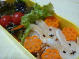 今日のお弁当(平成21年7月2日)今日は何も考えていませんでした・・・。きーくんからのリクエスト もなくどうしようと思っていたら、おいなりさんのあげがあったので いなり寿司のお弁当にしました。 これならごはんに酢も入って 痛みにくいしね♪ はんぺんは焼いてるので、ちょっと焦げ ミッフィーです(笑) *今日のお弁当* ・ ミッフィーおいなりさん(ゴマ、にんじん、はんぺん、のり) ・ ピーマンの肉詰め(合いびき肉、たまねぎ) ・ じゃことニンジン小松菜の甘辛いため ・ 別容器にぶどう、すもも 今日はバレーの日でした。 最初はエアコンが入ってなくてすごく暑かった・・・。 でも途中からエアコンも入り、楽しく体を動かしました。 |
