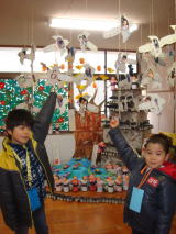 バザー当日(平成23年2月5日)5役は8時30分集合。おーちゃん、きーくんと一緒に 8時10分に家を出ました。 幼稚園についてすぐ、きーくんと作品の写真を撮ってバザーの 準備に取りかかる〜。といっても私はコーヒーをたてるだけ(苦笑) なんて役立たず〜・・・。 バザーが始まると、たこせんのさいころ係。当たり目が出たら もう一枚もらえるので。ひたすら声を出してたよ(笑) 今年はパパが仕事だったので、昼休みに少しきーくんの 作品だけ見に来てくれました(^^) 作品展を見て、すばやく コーヒー飲んでまた仕事に行くパパ。お疲れ様です。 12時半のバザー終了後、みんなで少し片付けをしてから お昼ごはん。 バザーでブレッドパパのパンを初めて購入した けれど、おいしかったわ〜♪ おーちゃんときーくんの分も買ってたんだけど、おやつを食べすぎだったので(今年は 長時間付き合わせるのでお菓子詰め合わせも買ってあげた)お腹いっぱいやわ〜。と 食べなかった・・・(T T) それから本格的な片付けと掃除。 お遊戯室はクラス役員さんと一緒に片付け、そこが 終わると一旦解散。 その後5役でアミーゴ室の片付けをしました〜。 終了したのが5時半。 朝、パパには「今日の夜ご飯は出来合いものになると思う〜」と 宣言していたママ(苦笑) 朝から夕方まで付き合ってくれた子供たちに、夕ご飯何 食べたい??と聞くと、「くら寿司〜!」ということだったので、帰りにくら寿司へ。 ママはポップコーンやらカップケーキやら食べすぎだったのと、疲れで全く食べる気が せず(汗) 子供たちが嬉しそうに食べるのを、見ているのが幸せでした(笑) 途中で パパからの帰るコールがあり、パパも合流。 すっかり疲れたママも、子供と一緒に8時半に就寝しました(汗) |