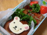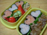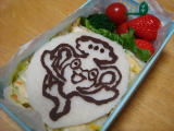 今日のお弁当(平成23年2月24日)今日は幼稚園の一日入園の日でした。 来年の年少さん が体験で入る日です。 この子守りのお手伝い(お母さんと 離れるので、泣きわめいたり脱走したりする子がいるので)を 5役がするのだけれど、私は抱っこなどができず戦力外(笑) なので、クラス役員さん二人にも今回は手伝ってもらって、ママは アミーゴ室で総会資料などを作っていました。 いや〜、聞こえてくる声だけでも、大変なのが伝わって きます(笑) 現在の年少さんから年長さんのみんなも、来年のリスさんを楽しませようと ホストを頑張っていたよ! 頼もしい限りです。 最近、寝るのが遅かったので目の下にクマが出来ている二人(苦笑・・・遅いといっても 9時前なのですが)なので、今日はおーちゃんもきーくんも7時半就寝。 早めに寝室に 上がったので、沢山絵本の読み聞かせができました(^^) おーちゃんにもORTを 読んでもらったよ♪ * 今日のお弁当 * ・ サンドイッチ、ツタージャお絵かきパン ・ いちご、ブロッコリー、プチトマト ポテトサラダと、卵・きゅうりのサンドイッチをしました。 デコペンでクッキングシートに ツタージャの写絵をして、パンをのせて冷やしてはがすとこんな風になりました(笑) |