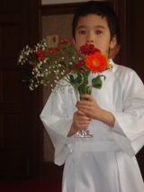 こどもの日祝福式/TE(平成23年4月27日)今日は幼稚園のこどもの日祝福式でした。 今回、きーくんは侍者(神父様のお手伝い)をすると幼稚園 から連絡をもらっていたので、行かないわけにはいかず。 式自体は30ぷんほどなので、姫ちゃん連れて行ってきました。 姫ちゃんはスリングでスヤスヤ寝ていてくれて、ママは きーくんの晴れ姿(?)をビデオにとることができたよ(^^) おーちゃんのときにも思ったけれど、侍者をする姿を見て、 年長さんになったんだなぁと不思議な感じになりました。 そして夜はテレフォンイングリッシュ。 姫ちゃんも登録した ので、リッスンオンリーでABCソングをリクエスト(笑) お宮参りを5月22日にすることにしました(^^) |