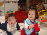 姫ちゃん9か月/お友達がきました(平成24年1月14日) フロムウエストのアンケートに応募して、リープフロッグの キッズパソコンが当たった〜!二日続けてうれしい〜☆ 今日は車検の日。朝9時半ごろに車を取りに来たので、 代車と交換。 パッソのあずき色。かわいかった〜♪ キーレス だったからなんかドキドキしたわ(笑・・家の車は違う) お昼ご飯を食べて図書館へ。 おーちゃん、図書館来ると自分で読みたい本を見つけて 読みだすんだけど、きーくんと姫ちゃんがあまり長時間もたないから、いっつも切り上げ させる・・・。せっかくなのにかわいそうだ・・・。 夕方に岡山からトモコが到着!! 二か月違いのこうくん、かわいかった〜!! 姫ちゃんもお姉ちゃん風を吹かせてみたり(笑) ちょいからんでいる姿がなんとも ラブリー♪ 一泊するので、ゆっくりしゃべれてうれしい〜(^^) 姫ちゃん今日で9か月になりました! 8〜9か月の成長は・・・・・・上の真ん中の二本の 歯が生えてきた。計6本。 離乳食をよく食べるように。 おやつ(赤ちゃんせんべい)も 食べ出した。 ずりバイメインですが、時々はいはいをするようになった。 ばんざーい とちょちちょち(手をたたく)をするようになった。 なんでもポイポイ。本棚から絵本を 引っ張り出して喜んでいる。 お風呂では立てると思うのか手を離す・・・。危ない・・・。 DWEのプレイアロングのDVDを2回ほどみたけれど、あまりというかほとんど興味なし。 とてもかわいくて(笑) いっつもかわいーかわいー言っています(笑) お兄ちゃんたちも かわいーかわいーと言いながら相手をしてくれるので、本当に幸せ者の姫ちゃんです☆ |
