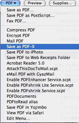 しかし、OSX10.4(Tiger)になってから標題のPDF/X規格が導入されておりPrint DialogのPDF Popupから[Save As PDF/X]を実行する事により、Macで見る通りの内容で相手に渡せることができるようになりました。