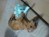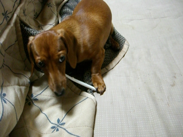 | 今日、久々にゆきやんに 怒られた。 くやしいので、紐をかんで すねてます。 |