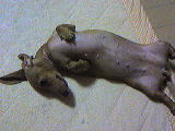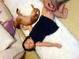 | 皆さんお元気ですか? 久々の登場で、心配してた でしょ?私も11日で10ヶ月 経ちました。最近は、散歩も 徐々に出来るようになり、 ゆきやんとさえみんが、 連れて行ってくれます。 でも、寝相が悪いようで、 いつもお腹を出しています。 ゆきやんやさえみんも上を 向いてお腹を上にしている のにどうして笑われるの かな?最近、さえみんが 美味しい食事を沢山作って くれるので、体重も4kgに なりました。今後も楽しい ことをしてホームページに 登場しますので楽しみに してね!! |