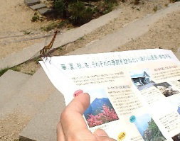 | (こんなふうにあちこちに止ってます・・) | (パンフの端っこに止まってます・・) | (人の腕に止まって逃げないトンボ・・) |