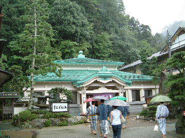 旅館で渡された湯かごを持って、 旅館の浴衣を着、旅館の下駄をはけば、 そのスタイルじたいが、外湯の入浴券です。 外湯の玄関には、ずらり、旅館の名前を書いた下駄が並び 帰ろうとするお客さんの浴衣を見ると、 さっと、その旅館の下駄が前に出てきます^^ まんだら湯(桶湯がありま〜す♪) |