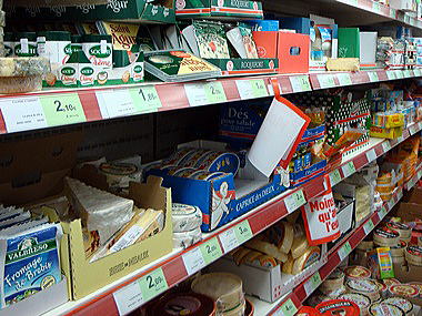 | パリのスーパーマーケットは、日本にもあるカルフールのような大きなものもあるらしいです。 でも、ホテルの近くに何軒かあったのは、わりと規模の小さなマーケット。 とはいえ、必需品は揃ってしまいます。 形式は日本のスーパーとほぼ同じですが、違うところも・・・。 まずは、何度も行って見よう見まねで買い物の仕方を会得した弟についていって、私も覚えましたが、 ほとんど「足手まとい」という気も・・・・(^^ゞ その違いというのは、まず一つ目、『たいていのスーパーは入口と出口がきっちり別れていて、買い物せずに出られない』こと。