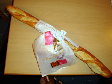 それから パンは、近くのパン屋さんで買ってきます。 バゲットを買うと、 こんな包装をしてくれます。 これを小脇に抱えて歩いて帰るのがパリ流。 バゲット1本がだいたい100円ちょっとです。 袋の中はクロワッサンが入ってます。 日本では「ミニクロワッサン」など 小さめのサイズが主流ですが、 しっかりと大きなクロワッサン、 これも一個100円くらいでした。 |