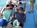 3分ほどしてイタリア人の女性が船長さんに彼がまだ海にいるので待ってというと、笑顔でニコニコしているがいっこうに止める気配なし・・・(英語がわかんないらしい)慌ててガイドに言う。ガイドは慌てて船長に、船が止まりユウターンすると一人の男性がプカプカ浮いてる(失礼とは思いつつも乗客は大爆笑)。彼を無事ひらっていざ出発!!