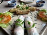 私たちが選んだのは生春巻きと揚げ春巻きと花にらと牛肉の炒め物、茄子のにんにくの油焼き、豆腐とニラのスープ、それに白いごはんが付いていました。