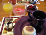今朝のメニューもマフィンにすいか、アメリカンチェリー、ジュース、紅茶です。
