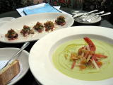 アラカルトでアスパラのクリームスープ、牛肉のバジルカルパッチョ、ワインをオーダー。