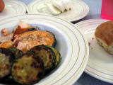 サーモングリル、マッシュルームとズッキーニソテー、モッツァレラチーズにゆで卵、パンそしてワイン、ペリエ。