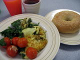 ほうれん草とトマトのソテー、スクランブルエッグ、ベーグル、オレンジジュース、紅茶・・・毎日同じものの繰り返し(笑)朝ごはんに関しては旅の実感がわかない・・・