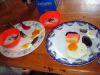 白粥、葱を油で揚げたもの、魚の燻製、ゆで卵、ピータン、目玉焼き、変な色のカステラでした。