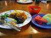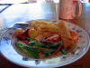 さてお昼ご飯です。古川君も一緒に食べます。フライドポテト、海老の中華風炒め、青梗菜の炒め物、インゲンのソテー、鱈のトマト煮、マカロニサラダ、春巻き、マンゴーでした。さすがにそろそろ飽きてきたねー。