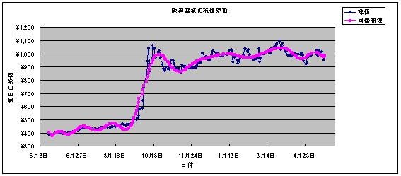 説明に入る前に、まず例題をみてみましょう。次の図はいま話題の阪神電鉄の株価1年間の毎日の最終終値を時系列的にまとめたものです。青色の不規則な変動が実際のデータ、ピンク色の曲線が最小自乗法により求めた回帰モデルによる曲線です。