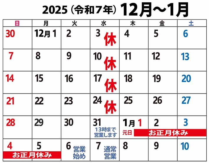 ![]() 令和7年11月の休業日。水曜日は定休日です。 |