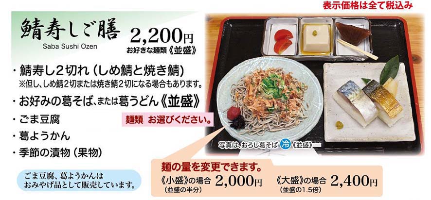 当店の普通盛りの麺の量は、比較的少し多めになっています。 全て 〈小盛〉 〈大盛〉 にできます。(本わさび葛そばは小盛はありません)) 〈小盛〉 は、麺が約半分の量になります。 〈大盛〉 は、麺が約1.5倍の量になります。 鯖寿しにちょっと麺類を食べたいという方には、〈小盛〉をおすすめします。 がっつり食べたいという方には、〈大盛〉を。けっこうなボリュームです。 |