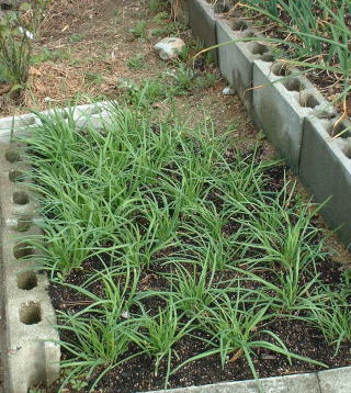ニラ畑。もう少し伸びたら収穫します。種から育てたニラで、やっと収穫です。右に見えるのは玉ねぎ。