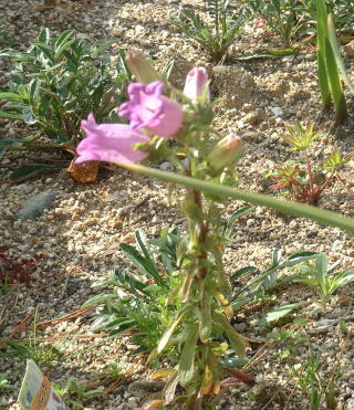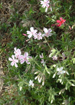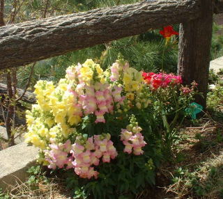 和室の南窓の下の花壇。キンギョソウのかたまりから1つ上に伸びているのはフリージア。