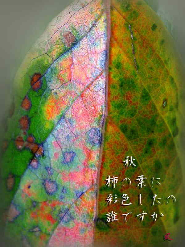 カメラで自然の草花を 写すようになって 一番得をしたことは 自然界の驚くほどの 美しさを 知った事です。 この柿の葉っぱにしても 生まれて初めて 真剣に柿の葉と 向き合いました。 季節の変わり目は こんな色をしていました いったい 何色使ってるのですかね? ほんと 驚嘆します。 秋が これから深まってさらに 華麗な変身をするのでしょうね