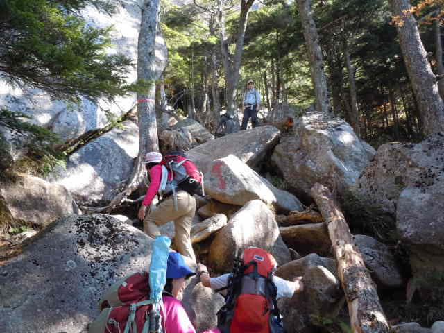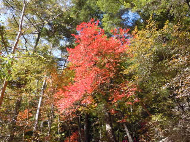 ・小川山分岐の標識を見て一旦下ります。 鞍部が天鳥川の渡渉部です。 多くの方が休憩していました(このあたりで初めての紅葉発見です)