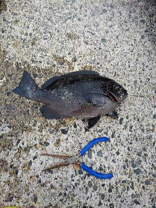 護岸の良さそうな穴を探して仕掛けを入れますと来ましたぁ~! 小気味よい当たりで良型ガシラが釣れましたぁ~(^^♪ 護岸の波打ち際は滑りやすいので注意が必要です・・・(*´з`)