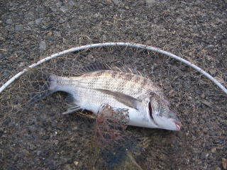 ノ)クルヽ() クル( ゚ー)クル(゚-^v) ブイ♪ 小振りながらようやく本命のチヌが釣れました。(^^♪