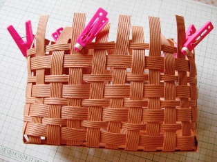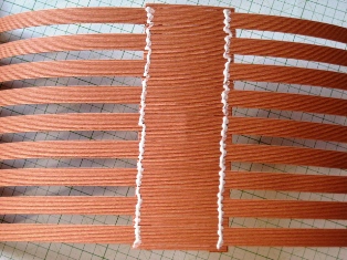 | 2-2 12本合わせ(太い方のテープ)を交互に編む。 D-1【側面太】12本合わせ62cm×1本 *つなぎめは、たてテープの裏に合わせる。 |
