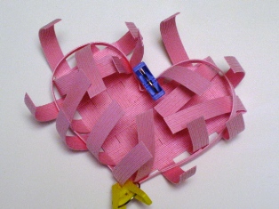 | ◆側面テープを編みこむ (5)テープのつなぎめが隠れるように洗濯バサミで 固定しながら交互に編みこむ。 2〜4段目も下の段と逆になるように交互に編みこむ。 折り目部分をしっかり固定すると良い。 |