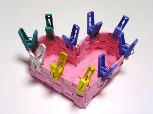 | ◆底たてを編みこむ (8)となりのテープと互い違いになるように交互 に差込む。 上下が同じ長さ残るようする。 (G)底たてテープ 34cm×1本 28cm×2本 (9)外回りをボンドで止める。 *ここで底の完成です。洗濯バサミをはずして 電話帳などの重石をのせて、 まっすぐにしっかりと乾かしましょう。 |