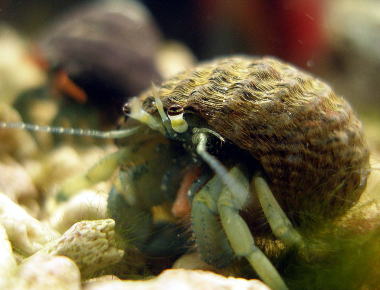 ![]() ユビナガホンヤドカリ 磯ではなくて内湾や河口近くの干潟に多いヤドカリ 泥や砂の上を歩きやすいように歩脚の第一節がちょっと長め、ゆえに「指長」・・だと思う。 ただし水槽内では貝組みに登っていることが多くて行動パターンはホンヤドカリとそう変わらない。 一昨年潮干狩りに行ったついでに採集してきた3匹のうちの生き残り。 目つきの悪さはホンヤドカリにひけをとらないが、1年以上宿貝を交換していないので、 ヒゲゴケだらけでちょっとまぬけな姿になっている。 通称 マリモ |