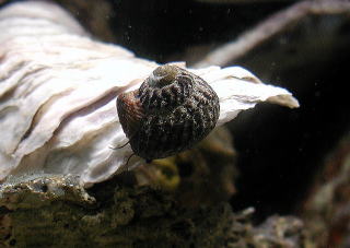 | 地味〜な住人その参 クボガイ+キクスズメガイ いわゆる苔取り貝なのだが同業のスガイやイシダタミが数ヶ月から半年くらいでヤドカリのお家になってしまうのに対して比較的丈夫でけっこう長生きする。 この個体も2年以上生きているのだが、これくらい付き合うと情も移ってくる。 ピンセットでワカメを口元に近づけてやると、うにょ〜と口吻を伸ばして食べにきたりするのだから、もはや立派なペット。 今年の夏は飼い主の頻繁な海通いのおかげで、常に新鮮なアオサや褐藻が水槽に入っていたせいか、いつになく活発に動き回っている。 そんな栄養状態の良さを示すのが、背中に間借りしているキクスズメガイ。 クボガイの食べこぼしや糞を食べているようだが、いままであまり目立たなかったのがこのひと夏でずいぶんと成長した。 宿主はかなりうっとうしそうだ。 |