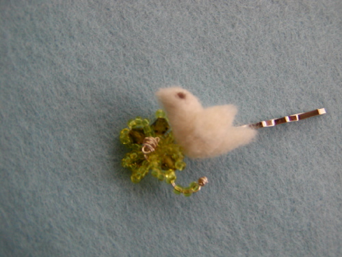 鳥とクローバーのヘアピン 手作りの鳥のモチーフ(フェルト)とオリーブ色のスワロフスキービーズでつくった四葉のクローバーがとてもかわいいヘアピンです。