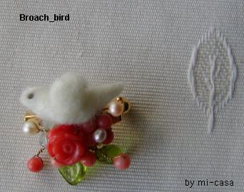 手作りの鳥のモチーフ(フェルト)と珊瑚のバラや花チェコビーズのリーフをあしらったブローチです。