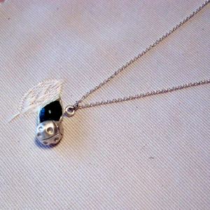 No2. Leaf&tento シルバークレイで作った葉っぱの土台に緑(写真は黒っぽいですが実際はきれいな緑です)のプレモを組み合わせてシルバーのてんとう虫を付けました。 こちらもつや消し仕上げ。 もちろんチェーンも純銀です。 チェーンの長さ:約40cm