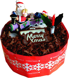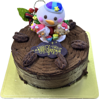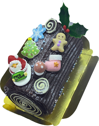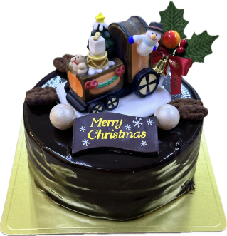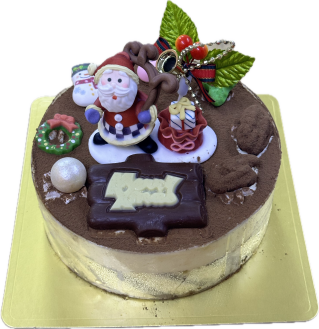 バージョンですチョコスポンジとチョコ生クリームを渦巻き状にしたアントルメです。汽車に乗ったサンタさんを飾りました。