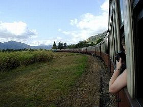 8時半ケアンズ発クランダ行きの切符を買うために8時から並びました。切符が全てツアーで買い占められてしまい入手出来ないこともあるとも聞いていましたが、運良くゲット出来ました! クランダ高原鉄道は100年以上の歴史を持つレトロな列車です。「世界の車窓から」の番組のトップで使われているのがこの汽車だそうです。 ゆっくりと熱帯雨林の中を1時間半かけて走りますが、時期的に乾季なためか余り雨林と言う感じは味わえませんでした。この辺りにはサトウキビ畑が広がって。 |