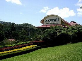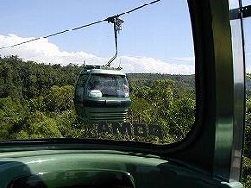 | スカイレールの駅です。 クランダ村からケアンズに帰るのには同じ列車を使わず、世界一長いといわれるケーブルカー『スカイレール』に乗りました。広大な熱帯雨林-バロン渓谷国立公園の上を通るのですが、これは自然そのままの本当に見事な世界でした!大台ケ原で見たような白骨化した樹木もチラホラ見られましたが、その雨林のスケールは何十倍(何百倍?)でしょうか! このスカイレールは全長7.5km、熱帯雨林保護のために全ての支柱はヘリコプターで運ばれたのだそうです。 ゴンドラの数は114個で4〜5人づつ乗っていました。 |