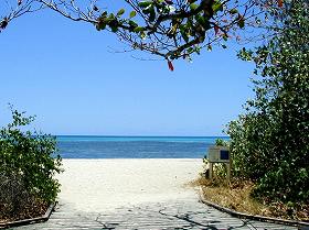 グリーン島の、この写真を見て頂きたかったのです。 ワニ園を出て、昼食を済ませて、いよいよビーチに。 標識に従って歩いてくると、眼前にパ〜っと『蒼い海』が。砂平線(~_~;)、そして水平線! ああ、グリーン島にやって来た〜!という感じ。 でもこんな小さな画像ではその感動を充分に表せないのが残念です。 |