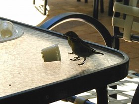 | グリーン島でサンドウィッチのランチを頂いていると、小鳥たちが食べこぼし?を狙って構えている。折角くつろいでのんびりと昼食をと思っていたのに、妙に落ち着かない。と、運良く隣のテーブルの人たちが食べ終えて去っていったので、鳥たちの興味はそちらのテーブルに。 鳥って、雑食性?ミルクがとっても気に入っていた様 子。で、クイズ4です。この鳥の名前は? 暗くて分かり辛いところが、クイズにピッタシですね。 多分○○○だと思います。 ヒント…英語では"white eye"と言うのだとか? |
