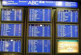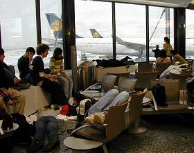 | 本当に広いクランクフルト空港! その離陸機の数の多さからもお分かり 頂けるでしょうか? 約3時間ほどの間に80機もの飛行機が 世界各地に向けて飛立っているのですね。 |